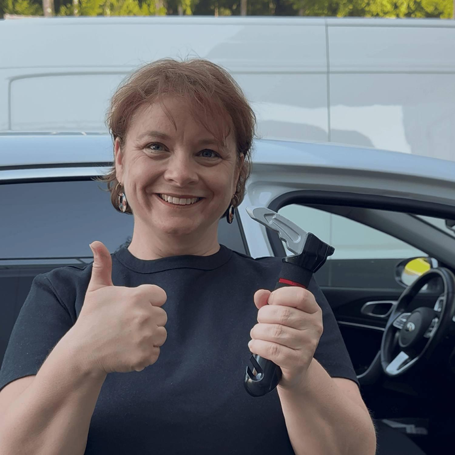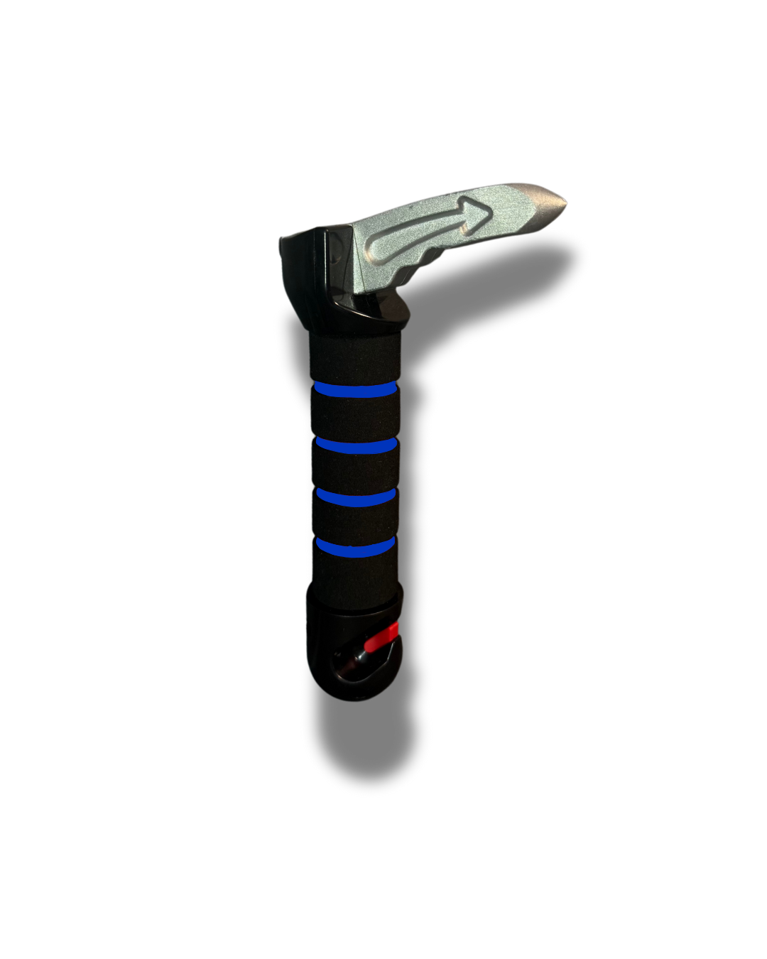 Im Griff integriert: ein gehärteter Glasbrecher sowie ein scharfer Gurtschneider, für maximale Sicherheit in Notsituationen.