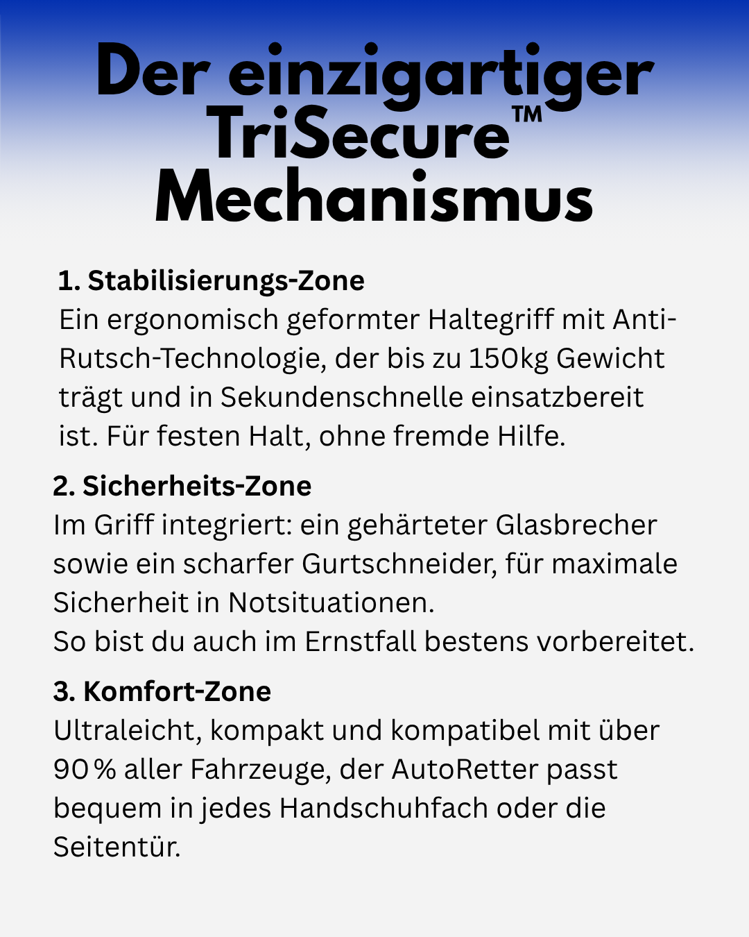 Die AutoRetter Einsteigehilfe basiert auf dem exklusiv entwickelten TriSecure™ Mechanismus, einem durchdachten 3-Zonen-System, das Sicherheit und Mobilität vereint: